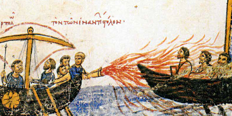 V septembri 718 prebiehalo takzvané druhé arabské obliehanie Konštantínopolu. Moslimovia blokovali tamojší prístav s desiatkami lodí a hotovali sa k útoku na plavidlá obrancov. Paluby sa hemžili veslármi i vojakmi a zrážku dvoch početných línií drevených lodí sprevádzalo lámanie brvien, cinkanie mečov a svist šípov. Krátko po začiatku bitky vydal byzantský admirál rozkaz, aby zaútočili menšie záložné plavidlá. Na palubách viezli grécky oheň. Plamene vyšľahli z akýchsi trúb, z ktorých zápalnú zmes vytláčali vzduchovými pumpami. Oheň začal pohlcovať viaceré arabské lode, ktorých posádky však boli pripravené. Vylievali na požiar kýble vody a snažili sa ho uhasiť. Aké však muselo byť ich prekvapenie, keď plamene ani náznakom nepoľavovali? Zúfalí Arabi si rýchlo vyzliekali brnenia a skákali do vody, zatiaľ čo flotilu pohlcoval požiar. Smoliari, ktorí nestihli vyskočiť, zhoreli. Iní zasa opúšťali lode v ťažkých brneniach a klesali pod vodu. Ani plavci nemali vyhraté, oheň sa šíril aj po hladine. Keď veľká časť lodí zhorela, Arabi signalizovali ústup. Zvyšok plavidiel neskôr zlikvidovali búrky a nájazdy Byzantíncov.