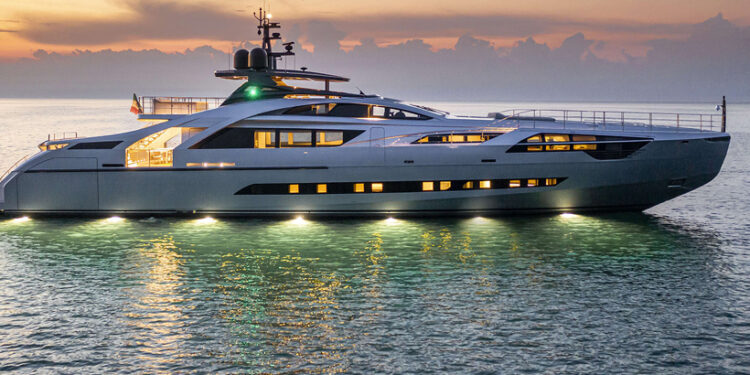 Sivá superjachta má zvláštny predok, ten je mierne skosený a zdobí ho vkusný „auto gril“ z guľatých trubiek. Na materiáloch a dizajnových doplnkoch sa nešetrilo. Zvonku sú to skôr ostro rezané hrany v sivo – čiernej, interiéru prevláda bielo – čierna kombinácia. Ubytovacie kabíny (5 ks) a spoločné priestory poskytujú dosť priestoru pre hostí (10) a posádku (8). Kapitánsky mostík pod ostro skosenou časťou je plný moderných technológii pri ktorých sa hádam ani nedá zablúdiť. Sekundárne ovládanie jachty je dostupné na vrchnej palube. Zadná odpočinková časť ponúka sedačku kreslá a širokú vonkajšiu posteľ. Tromi schodmi nadol sa dostanete k jedálenskému stolu a salóniku. Schodmi nahor prídete na slnečnú palubu s malým barom, opäť ležadlovou časťou a s trochou fantázie aj mini tanečným parketom. Kuchyňa nie je veľká ale poskytuje všetko potrebné vybavenie pre hladných obyvateľov. Vnútro jachty poskytuje aj miesto na gumený motorový čln a vodný skúter.