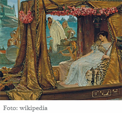 Kleopatra VII. je neraz známa kvôli svojmu talentu na zvádzanie mocných mužov a budovaniu výhodných spojenectiev. Treba ale pripomenúť, že jej posledný vzťah i aliancia skončili smrťou oboch milencov a k pádu ptolemaiovskej dynastie, ktorej počiatky siahali k jednému z generálov Alexandra Veľkého. Jej partner Marcus Antonius mal ako jeden z triumvirov na starosť východné rímske provincie. Povolal k sebe Kleopatru, ktorú podozrieval z napomáhania nepriateľom Ríma, a tá ho chcela očariť rovnako ako pred ním Julia Caesara. Priplávala na opulentnej lodi odetá ako bohyňa Venuša a uspela. Nadviazali vzťah, ktorý napokon vyústil do rímskej občianskej vojny. Na jednej strane stáli Marcus Antonius a Kleopatra, na druhej ďalší z triumvirov Octavianus (neskorší cisár Augustus). Ten dvojicu porazil v námornej bitke pri Actiu v roku 31. pred Kristom. Pri Alexandrii potom nasledovala ďalšia Antoniova porážka, po ktorej sa Marcus dopočul, že Kleopatra je mŕtva, a tak sa prebodol. To však nebola pravda. Kleopatra ešte žila, ale spáchala samovraždu, keď sa dopočula o Antoniovej smrti. A tak získal Shakespeare námet na jednu zo svojich najznámejších tragédií.