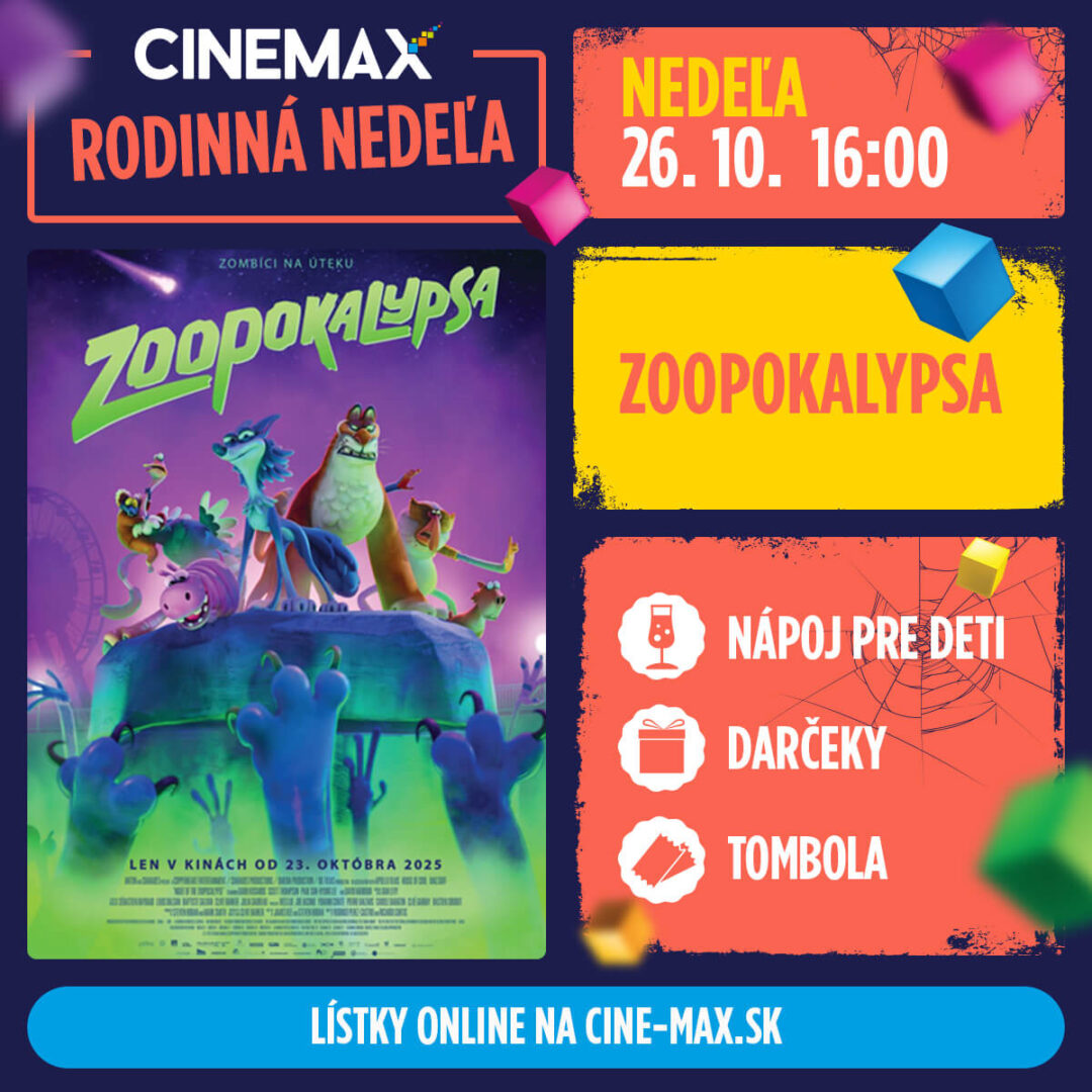 Chcete si Halloween užiť plnými dúškami už od tohto víkendu? Pre detského diváka sa Halloween v kinách CINEMAX začne od 23. októbra uvedením animovanej novinky Zoopokalypsa. Príbeh zdanlivo pokojnej zoo, v ktorej sa šíri záhadný vírus, mení zvieratká na zombíkov. Našťastie ide o vtipné a nešikovné zvieratká. Film je bláznivou komédiou s prvkami napätia, no spracovanou s humorom a nadhľadom, takže ho ocenia deti aj dospelí. Zoopokalypsa bude súčasťou aj rodinnej halloweenskej nedele 26. októbra, keď vo všetkých kinách CINEMAX čakajú deti darčeky a pre tých, čo prídu v maske alebo kostýme aj sladké prekvapenie.